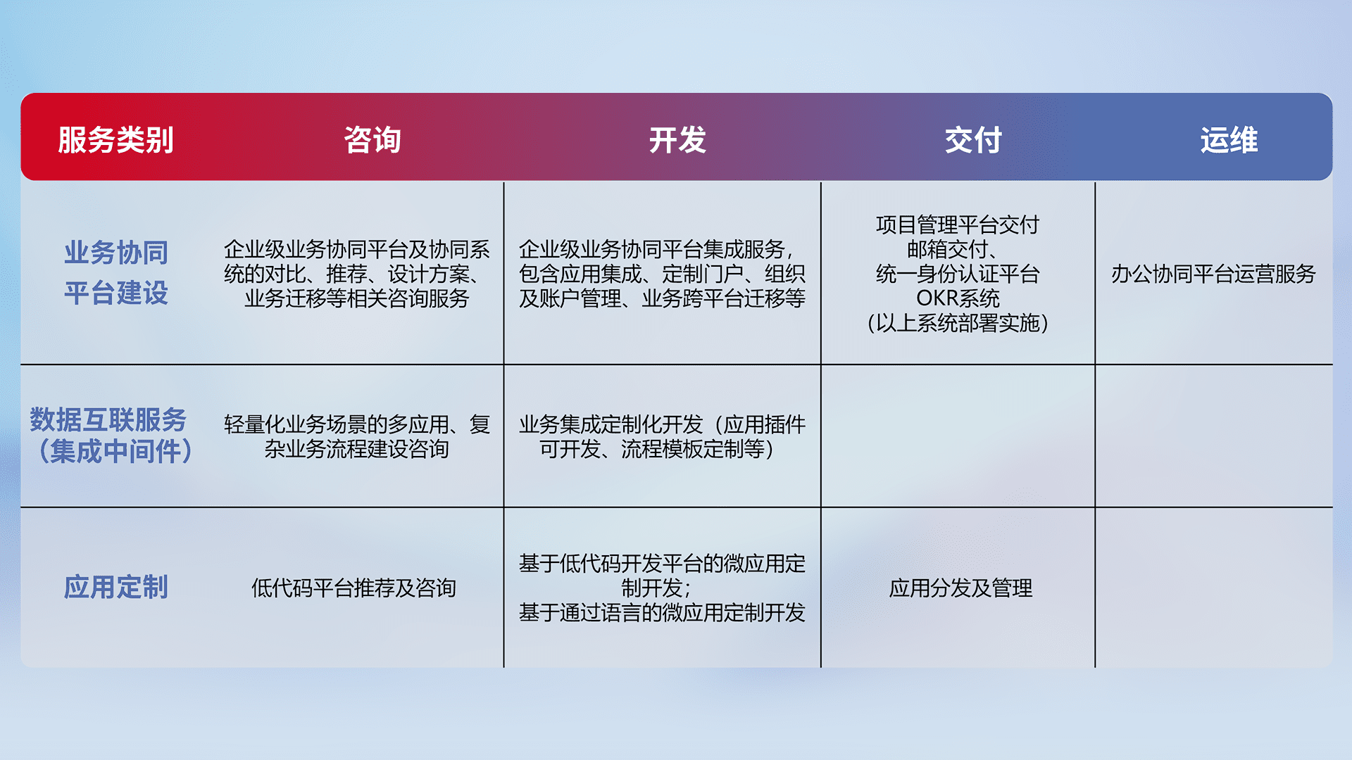 针对钉钉、、、、企微、、IDaas等平台级产品提供产品的规划、、、方案、、、、交付、、、定制化开发等服务,,,,实现如统一协同办公、、、、智能客户服务、、、混合会议管理、、、智能数据查询、、等业务场景,,实现数字化转型。。。